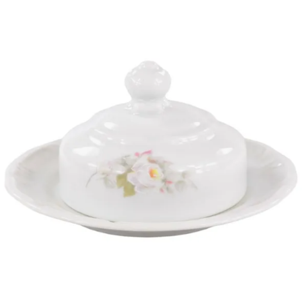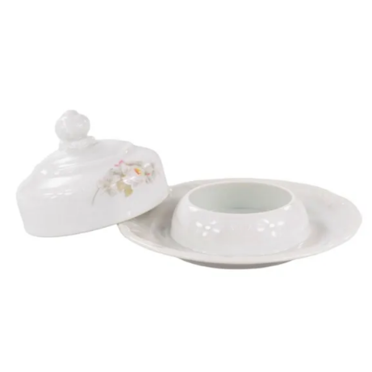 Manteigueira em porcelana linha branca com design colonial. Um item elegante para compor sua mesa de café. Beleza e requinte em sua mesa! Leve à sua mesa toda a beleza e qualidade das porcelanas Schmidt.